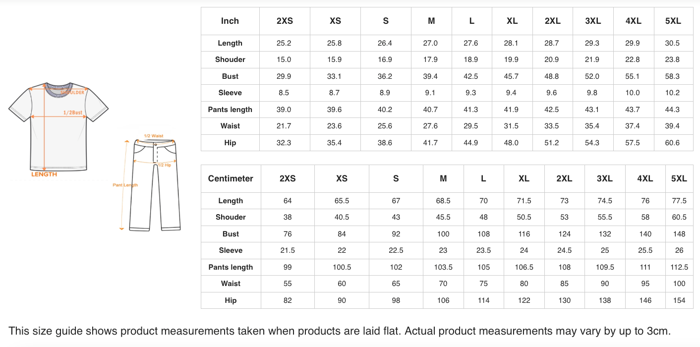 2XS, XS, S, M, L, XL, 2XL, 3XL, 4XL, 5XL